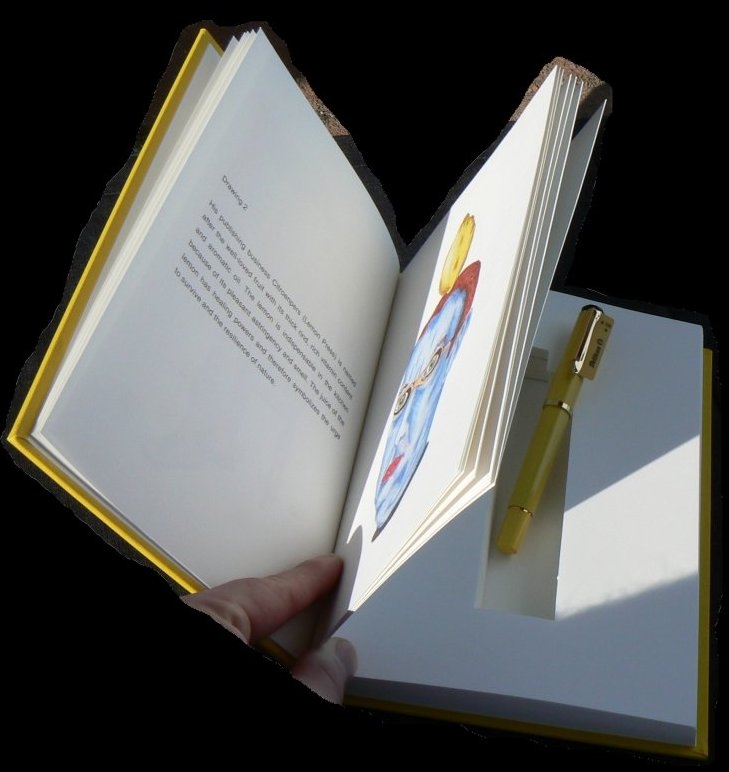 | Pelikan M200 Citroenpers im Artbook - 25 Jahre Citroenpers. Im Buch sind einige Seiten ausgeschnitten, damit der Füllhalter darin Platz findet. |